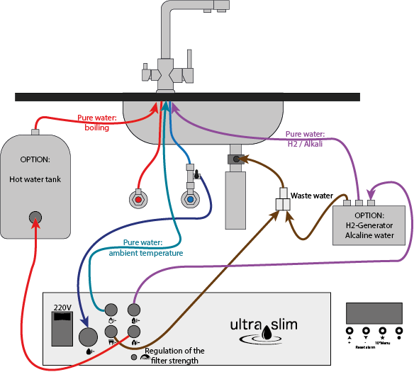 - Purified ambient temperature water and 3 additional options: ambient temperature water, hydrogen water (optional), alkaline water (optional), hot water (optional) and remineralised water (optional).